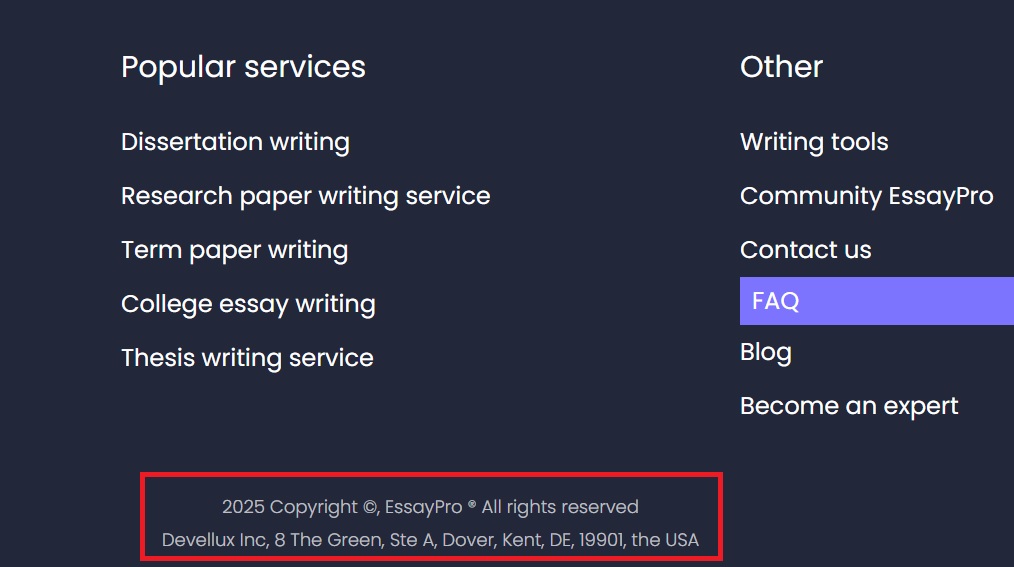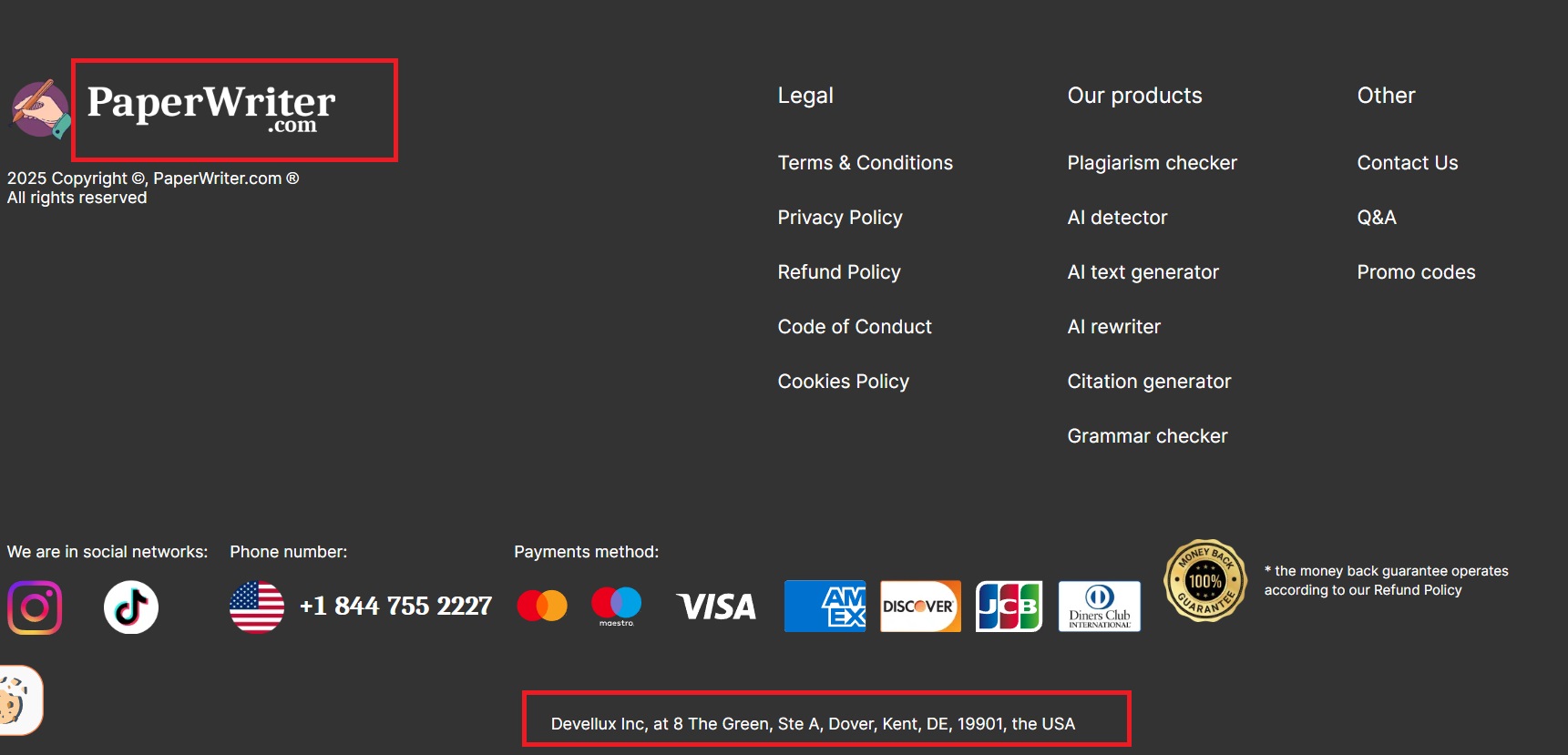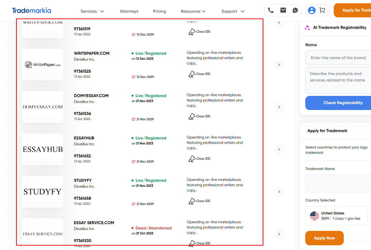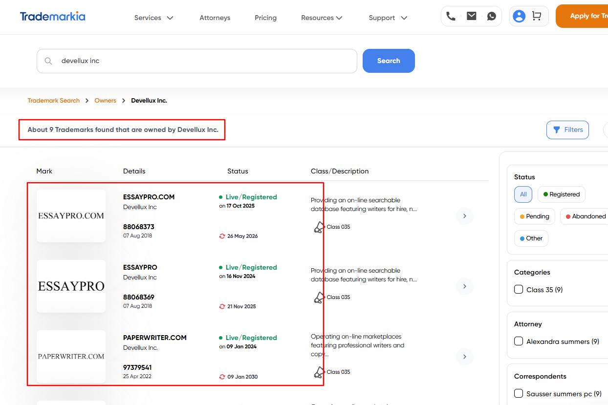 According to ownership listings on platforms like Trademarkia, multiple trademarks related to these essay-writing services are registered under Devellux Inc. This connection raises important questions:Are these platforms genuinely independent? Or are they strategically fragmented brands designed to capture as much student traffic—and money—as possible?