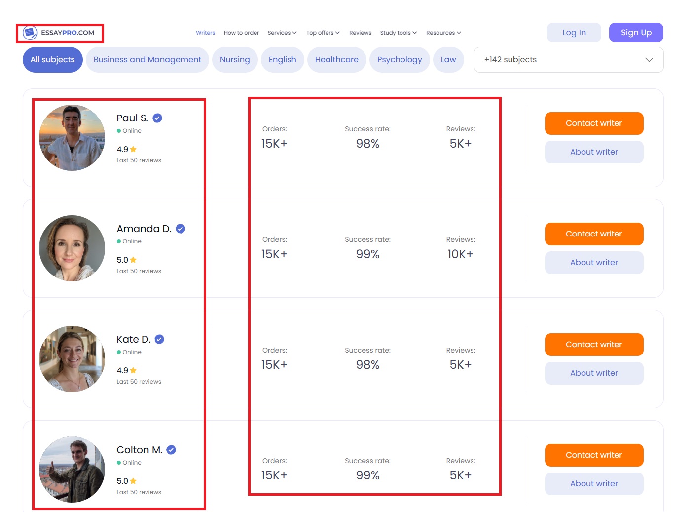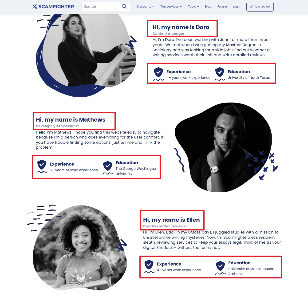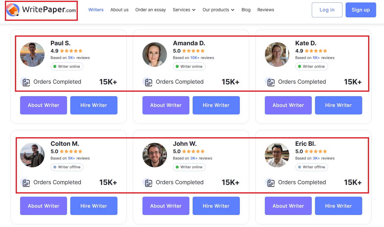 One of the strongest indicators that these websites are not independent is the mirrored writer profiles that appear across EssayPro, PaperWriter, EssayService, Studyfy, WritePaper, and DoMyEssay.
